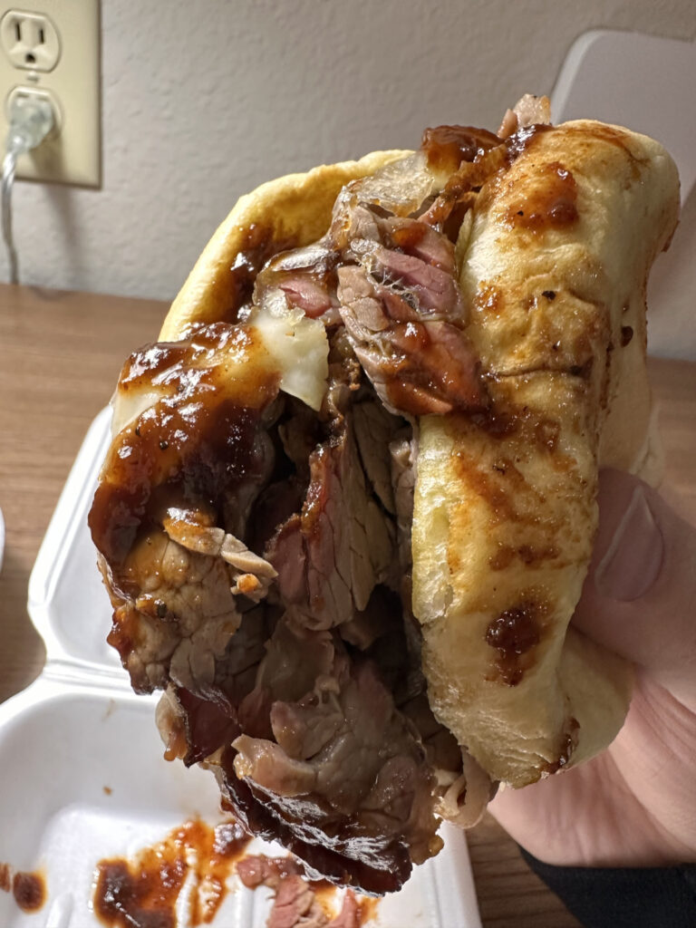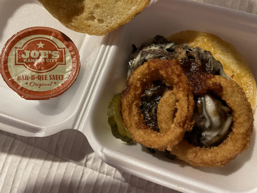 When my streamer friend admitted that he’d never had brisket or burnt ends, chat recommended that we meet up at Joe’s and that the streamer try their signature sandwich, The Z-Man. Joe’s describes the sandwich as consisting of “slow-smoked beef brisket, smoked provolone cheese, topped with two crispy onion rings, on a toasted Kaiser roll.” I later discovered that the Portobello Z-Man, which I got, also had onion rings. I’m an onion ring guy. Fries? Meh.