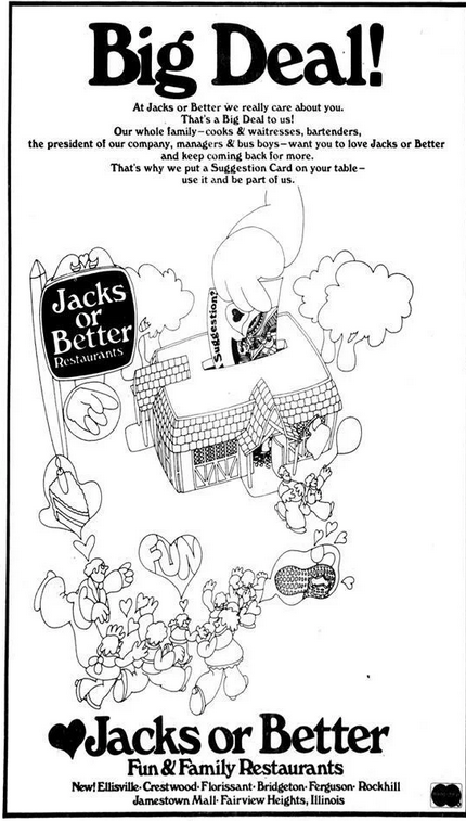 Jacks or Better was a small chain with locations in St. Louis, Kansas City, and New Orleans. Curiously remembered as allowing, perhaps encouraging, diners to leave peanut shells on the floor.