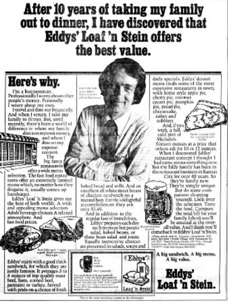 One classic delicatessen that fed Kansas Citians over several decades was Eddy’s Loaf ‘N Stein. First opened in 1965, the local delicatessen chain eventually had 17 locations. The chain was closed by 1983. Had locations in Prairie Village, Downtown KCMO, The Plaza, Ward Parkway Mall and Metcalf South Mall.