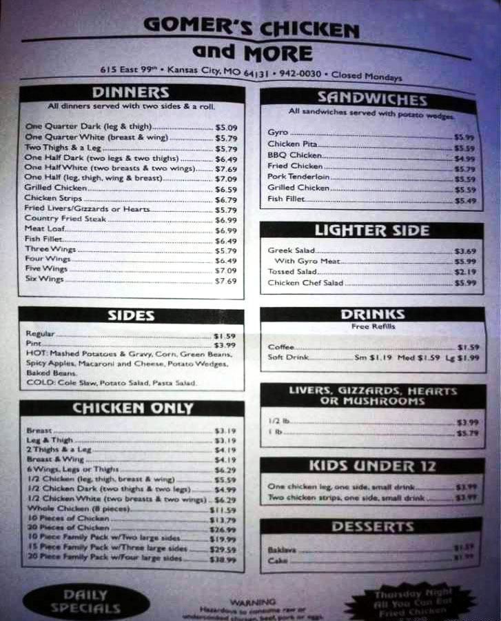 If you wanted chicken from a non-chain and lived in south Kansas City, Gomer’s was a popular choice for many years. I remember the opening of the restaurant since I grew up in the neighborhood. Gomer’s started as a gas station and then morphed into the chicken restaurant and liquor store. The liquor store is still in operation at 99th and Holmes and there are three other locations.