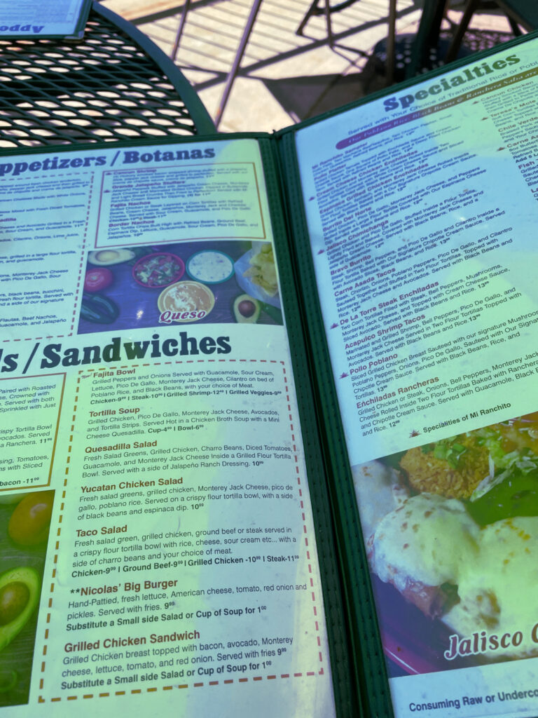 Let’s talk about the menu. In this case, menus. Most Mexican restaurants have menus with lots of options, but Mi Ranchito has that and more. They have a huge specials menu. Large menus can induce a case of choice paralysis, but they also give you the opportunity to try new dishes. Then it’s a case of the kitchen being up to putting out anything diners are ordering that day.