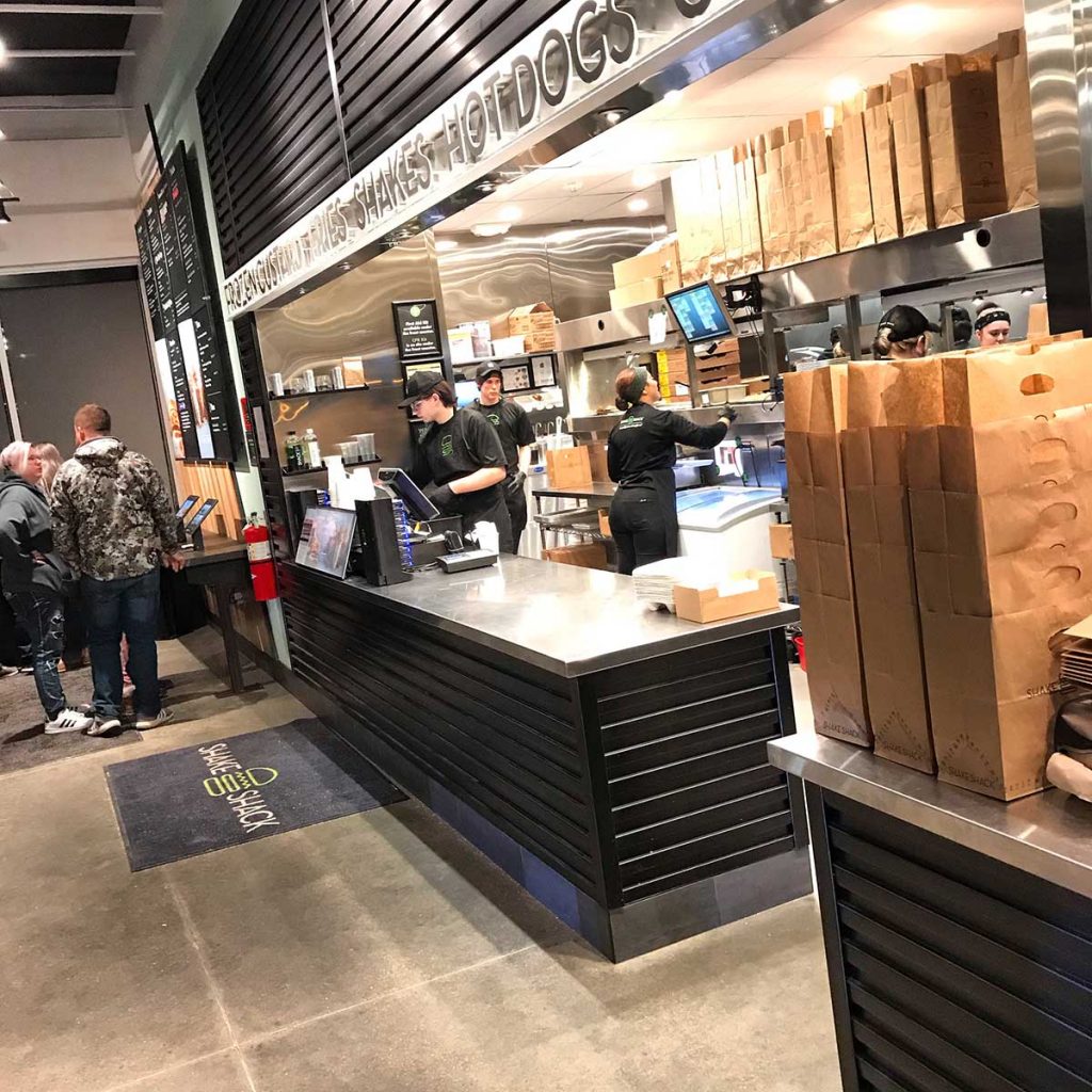 On my lunch visit, the Shake Shack was busy, and seating was easy to find. On our dinner visit, the restaurant was packed, and seating was scarce. During the rush we experienced, quite a few people were hovering around, waiting for seating.
