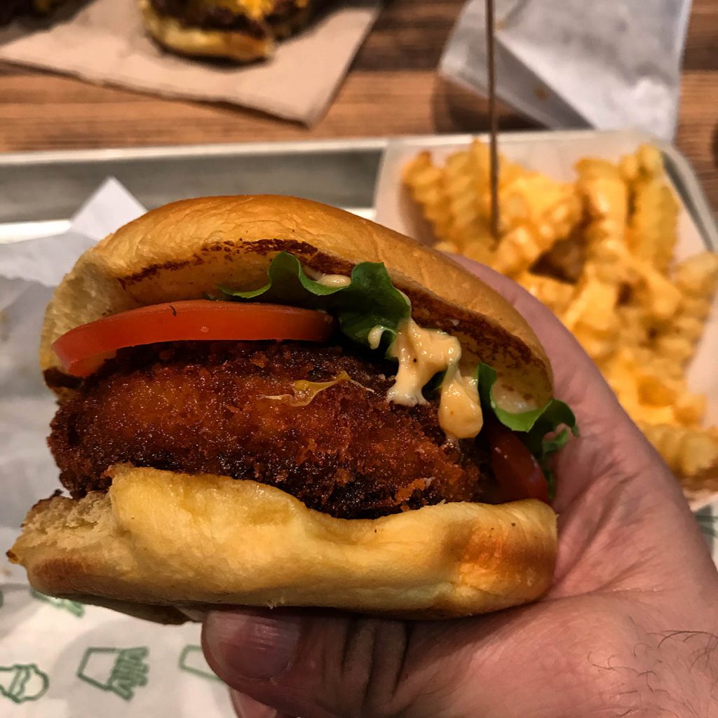 On my two visits, I had the ‘Shroom Burger, which features a “crisp-fried portobello mushroom filled with melted muenster and cheddar cheeses, topped with lettuce, tomato, and ShackSauce.