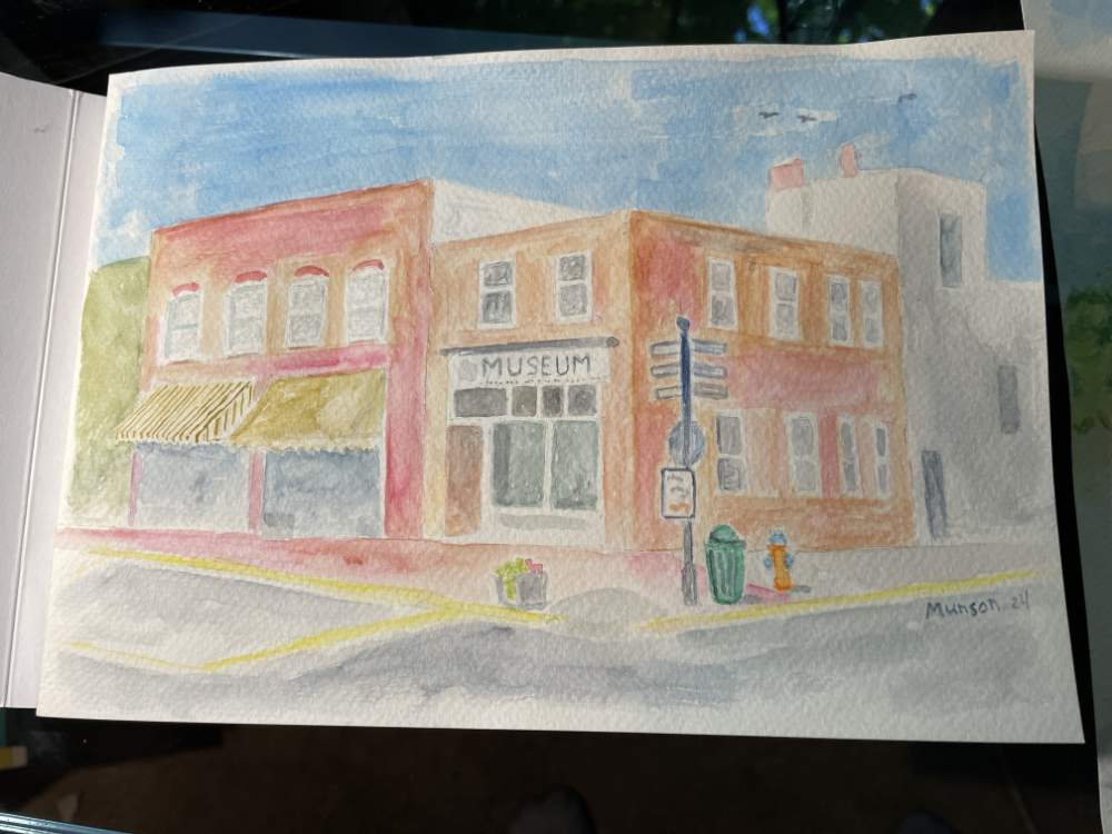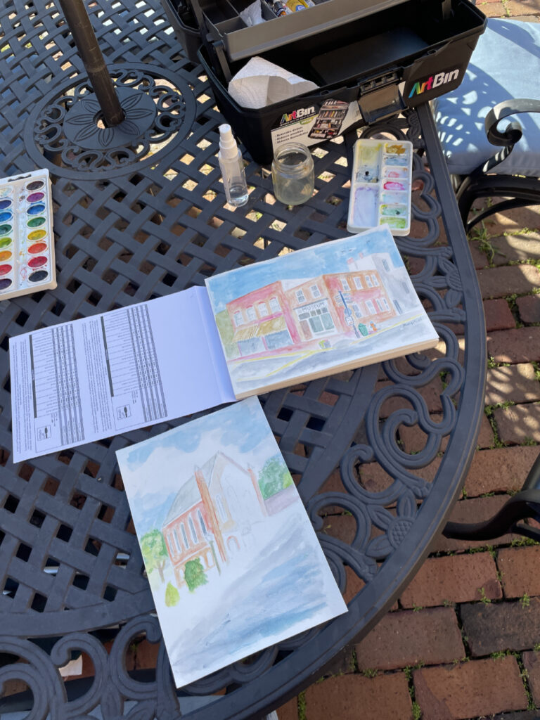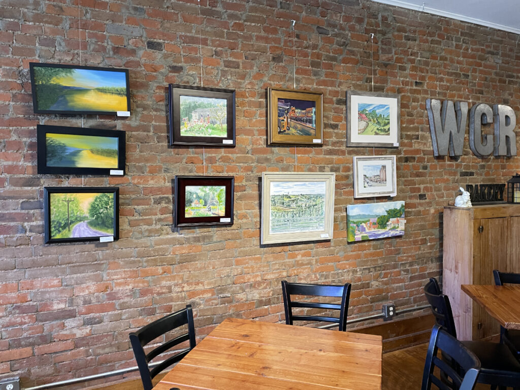 The coffee shop actively displays art from local and regional artists. They recently sponsored a weekend of plein air painting around Weston. I took part in this event (see my art below). Around 16 artists set up around town, outside (plein air), and painted gardens, streetscapes, landscapes, people, and more.